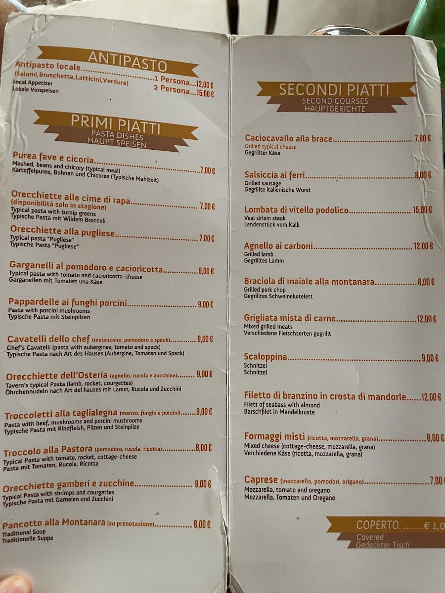 The offerings range from simple antipasti like Antipasto Locale to rustic homemade pasta such as Orecchiette Alle Cime Di Rapa and Pappardelle Ai Funghi Porcini. Grilled specialties, including the Grigliata Mista Di Carne and Caciocavallo Alla Brace, bring a satisfying depth to the menu that pairs nicely with their house red wine.